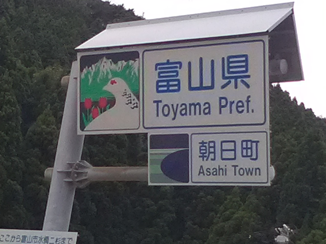 振り返ればすぐそこに、富山県と朝日町のカントリーサインが!!