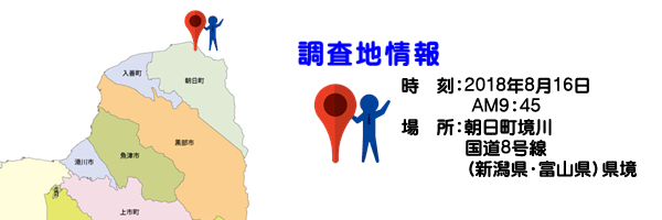 国道8号線を富山市中心部方向へ走ることしばらく、朝日町、入善町の境界線を流れる河川「小川」付近に到着、車を止めることが可能な場所を探していたら「小川」を超えてしまいあっさり入善町のカントリーサインを発見。